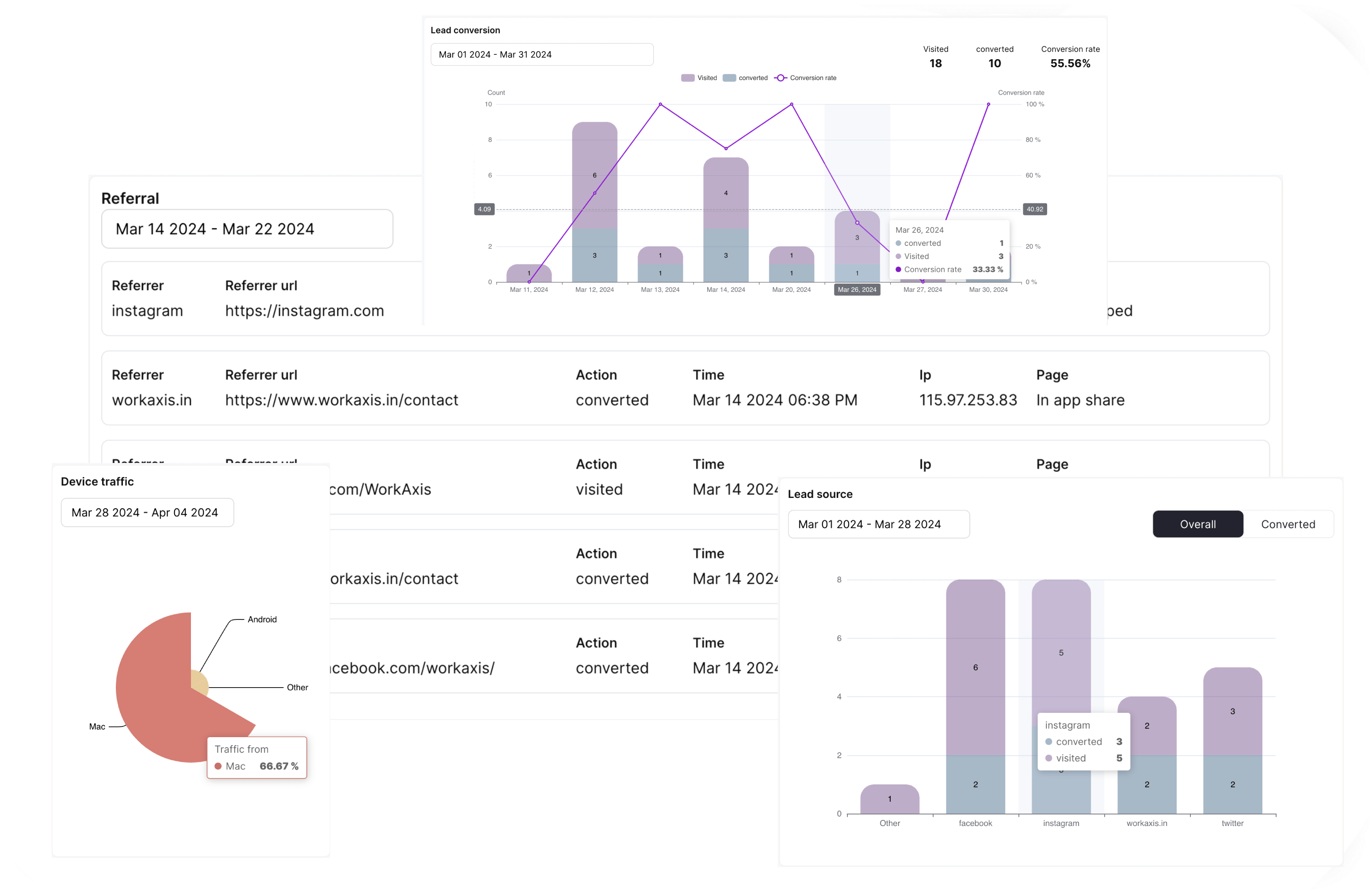 Unlock insightful analytics, tracking essential metrics including conversion rates, lead growth, device traffic, and campaign conversions.