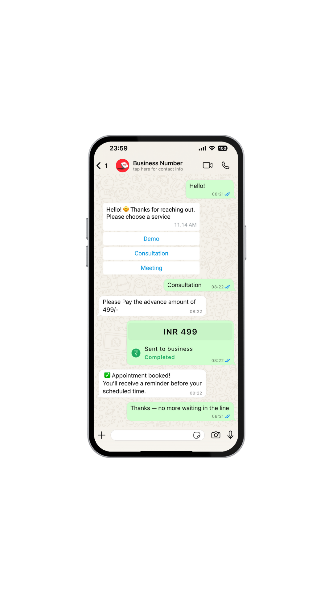 - The system replies instantly with a personalized greeting or confirmation.