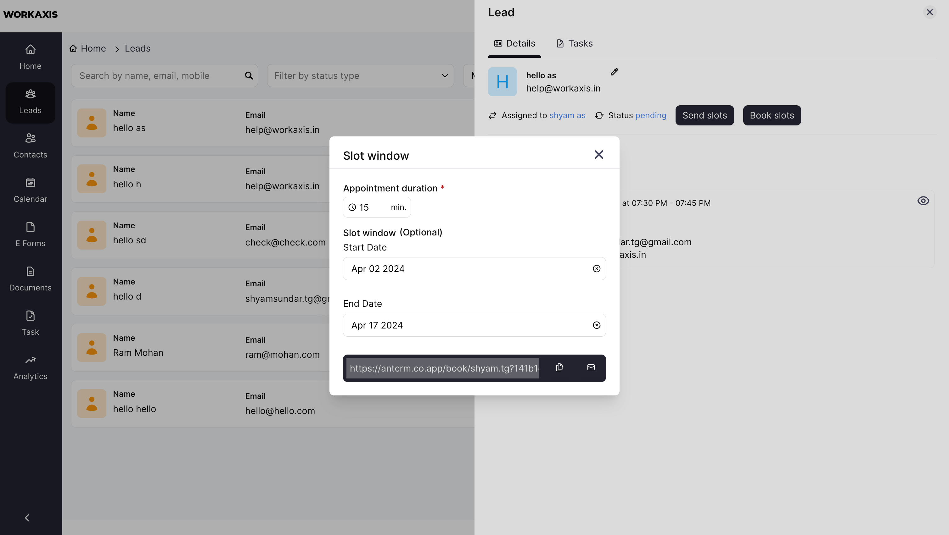 With Ant CRM's Booking feature, you have the flexibility to choose between two convenient booking options. You can either directly send the appointment booking link to your clients for a quick and hassle-free booking experience, or you can integrate it with a lead capture form to gather additional information from potential leads.
