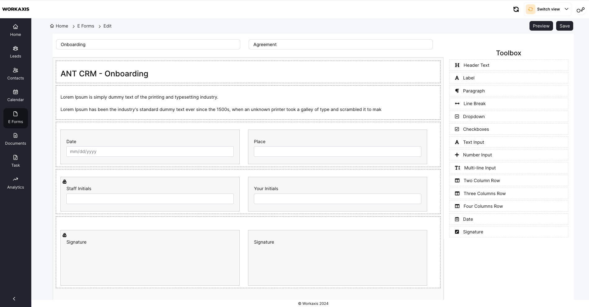 Ant CRM simplifies the process of creating electronic forms with its intuitive user interface. Owners and administrators can effortlessly build custom E-Forms from the UI, tailoring them to their specific requirements. With drag-and-drop functionality and a wide range of form fields to choose from, designing E-Forms has never been easier.