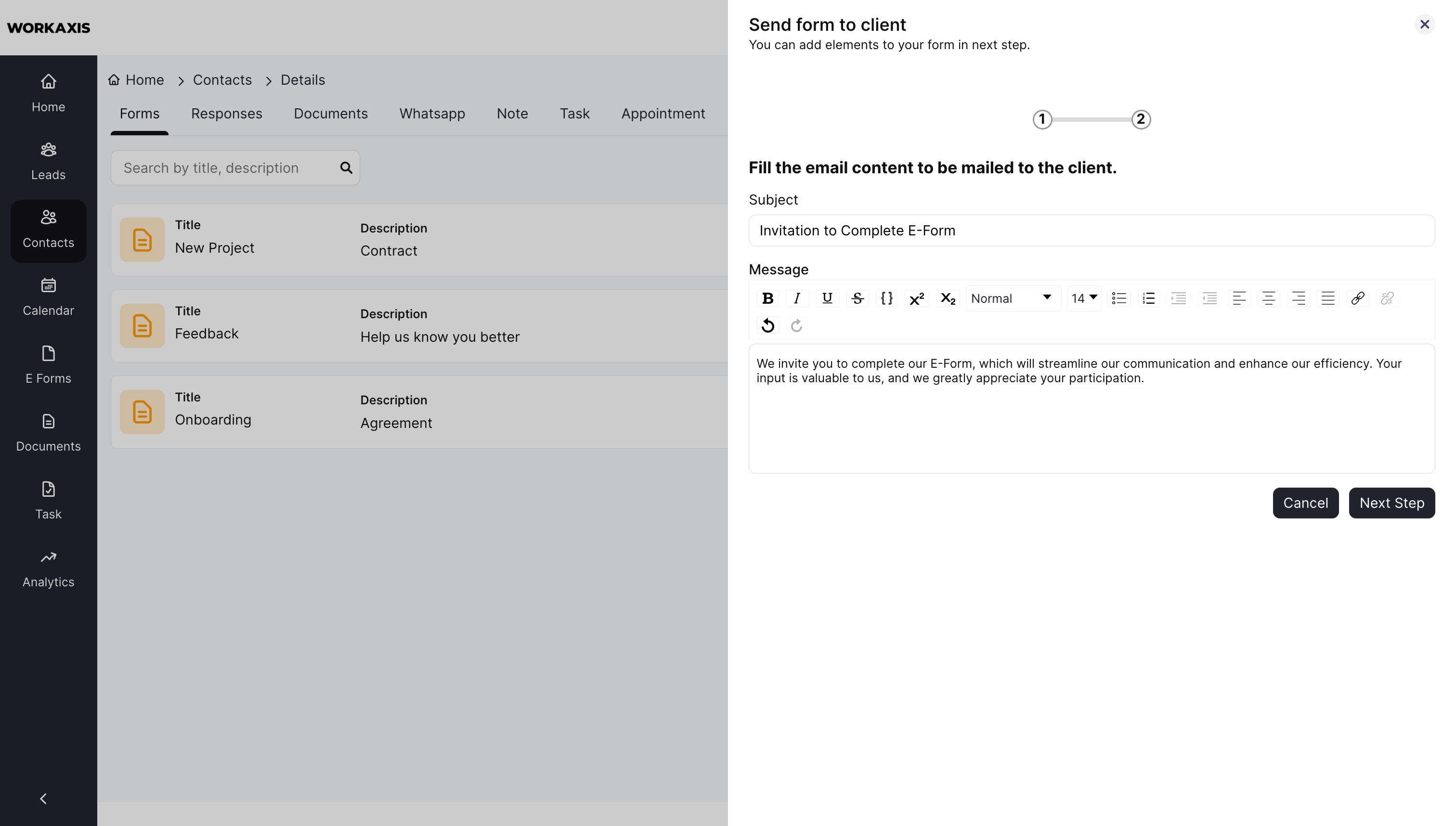 Clients can effortlessly complete and submit E-Forms, streamlining the data collection process. Upon submission, staff members can promptly review the responses and act accordingly. Ant CRM also facilitates the saving of responses as PDF documents, offering a convenient means to archive, share with clients, and email the generated PDFs