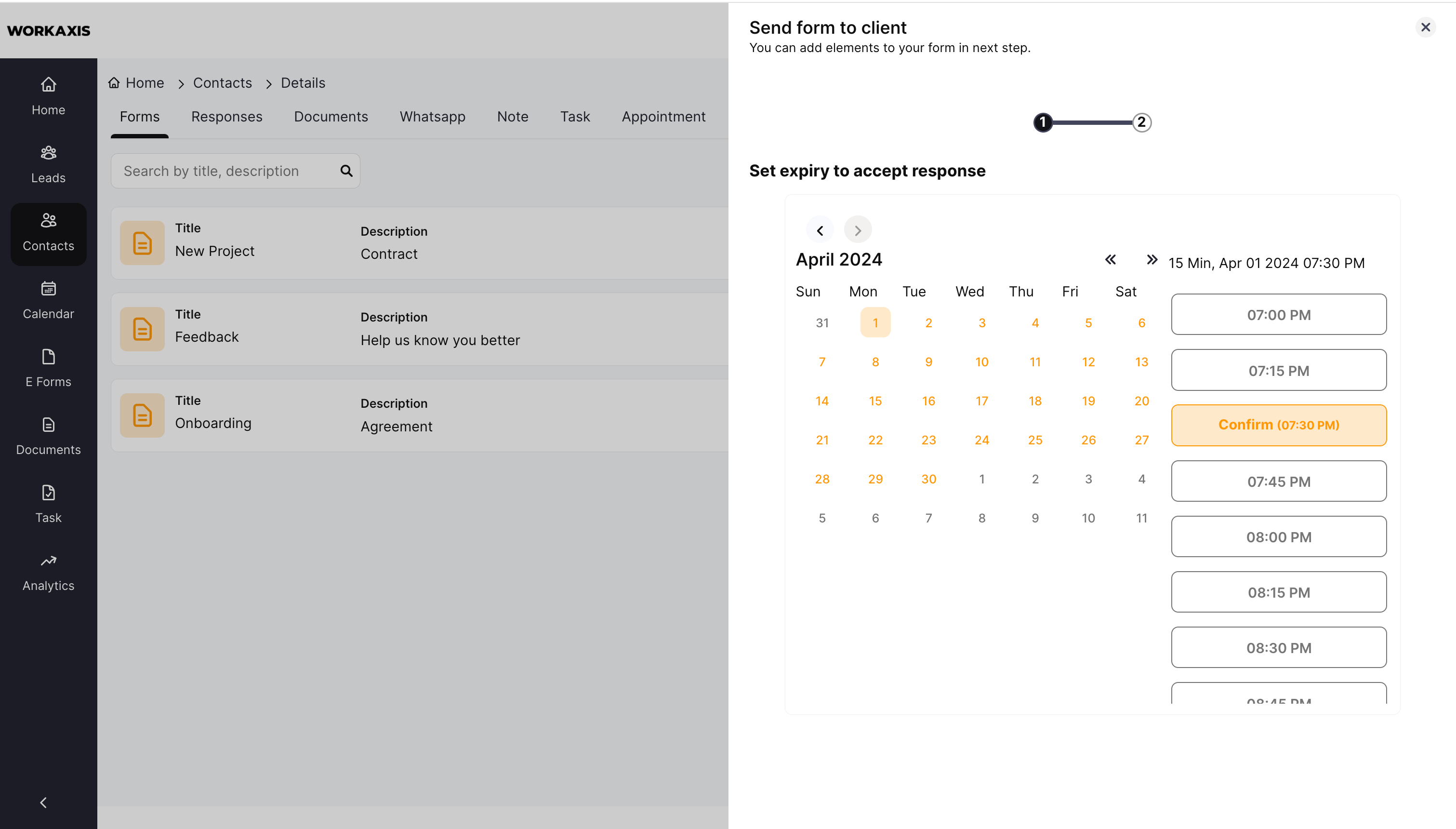 Sending E-Forms to clients is effortless with Ant CRM's seamless email integration. Users can send E-Forms directly from the interface, ensuring that clients receive forms promptly and securely.Maintain control over your data by setting expiry times. This feature ensures that sensitive information remains protected and only accessible within the designated timeframe, enhancing security and compliance measures.