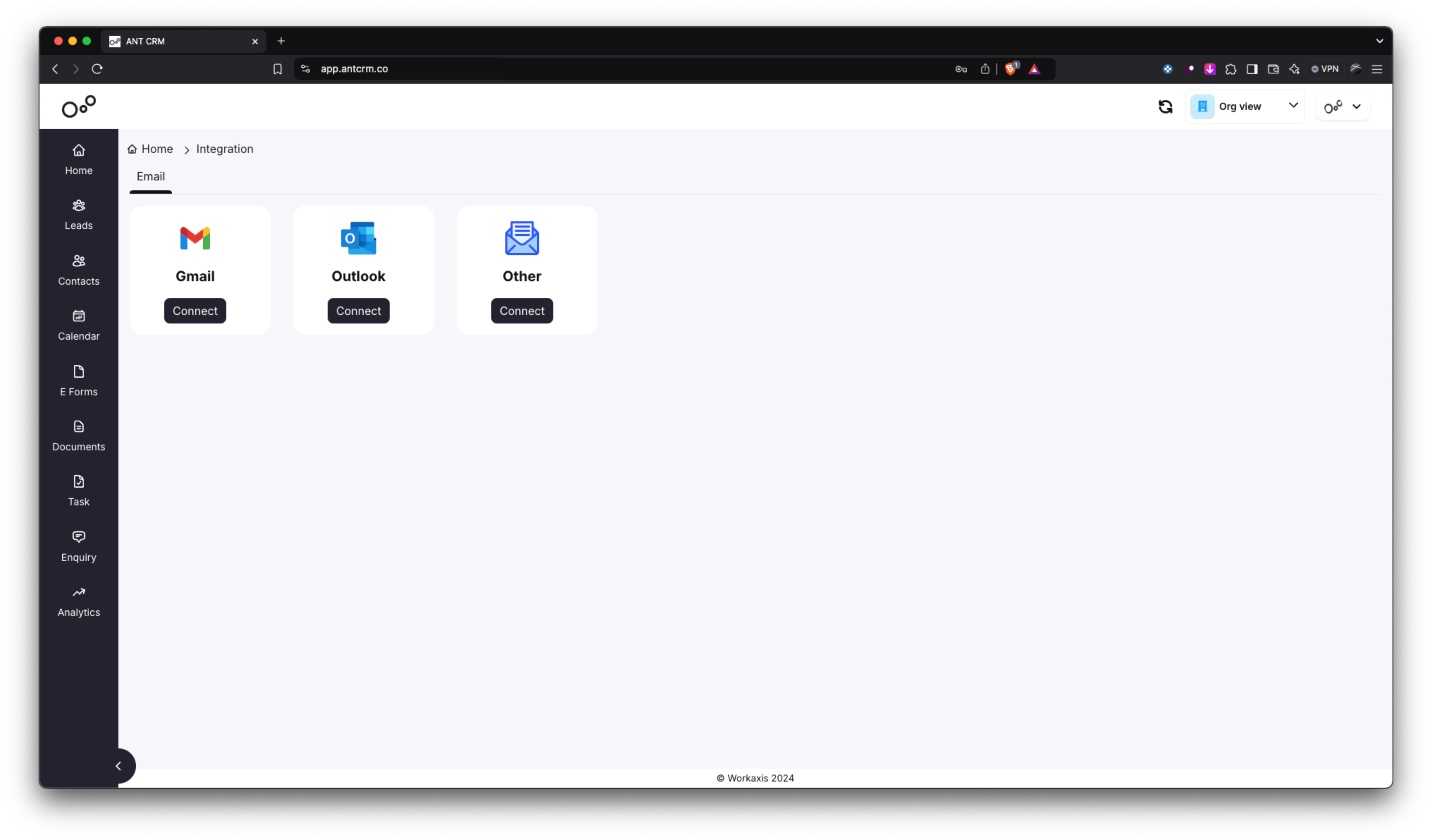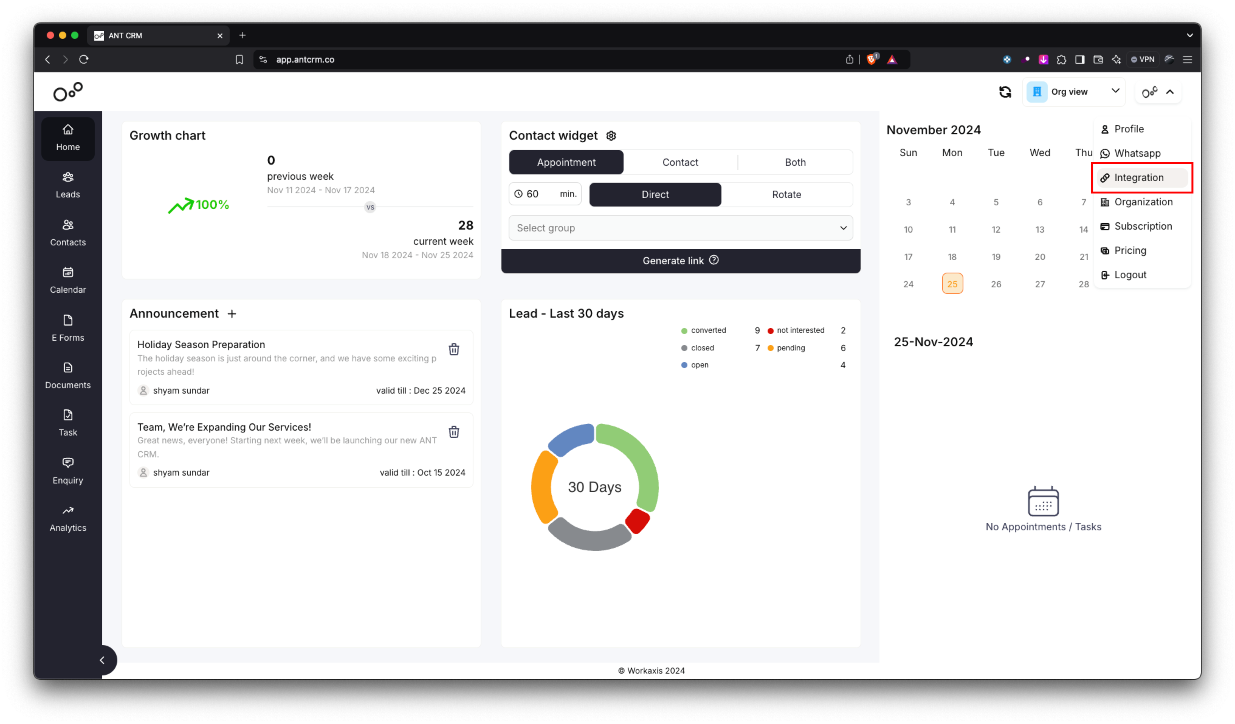 1. Go to ANT CRM and click on "Integration" from nav dropdown.